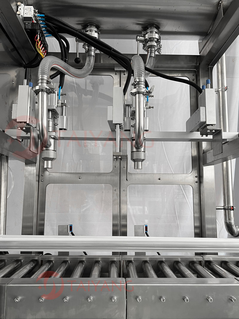 它采用磁力泵灌装,响应速度快,两个灌装头可同时工作。它配备传感器,只有在识别到产品后才会开始灌装。