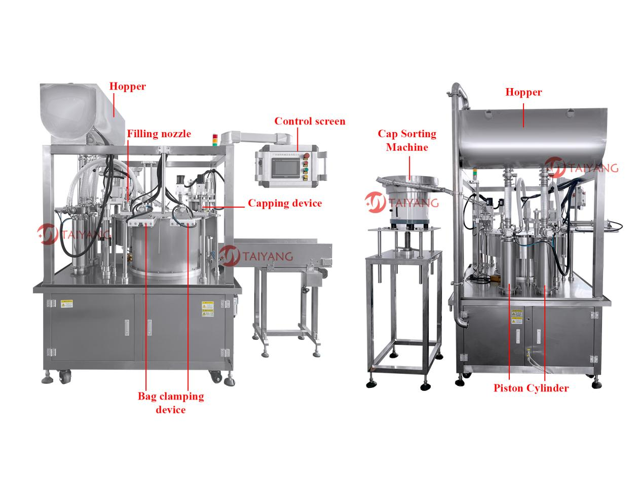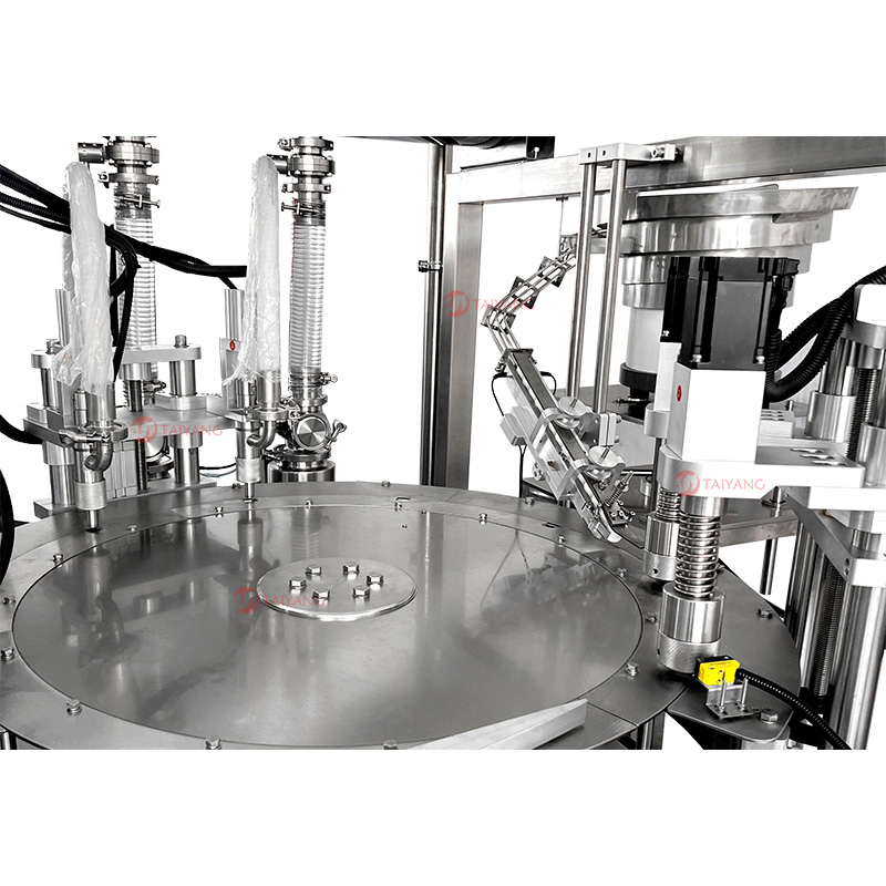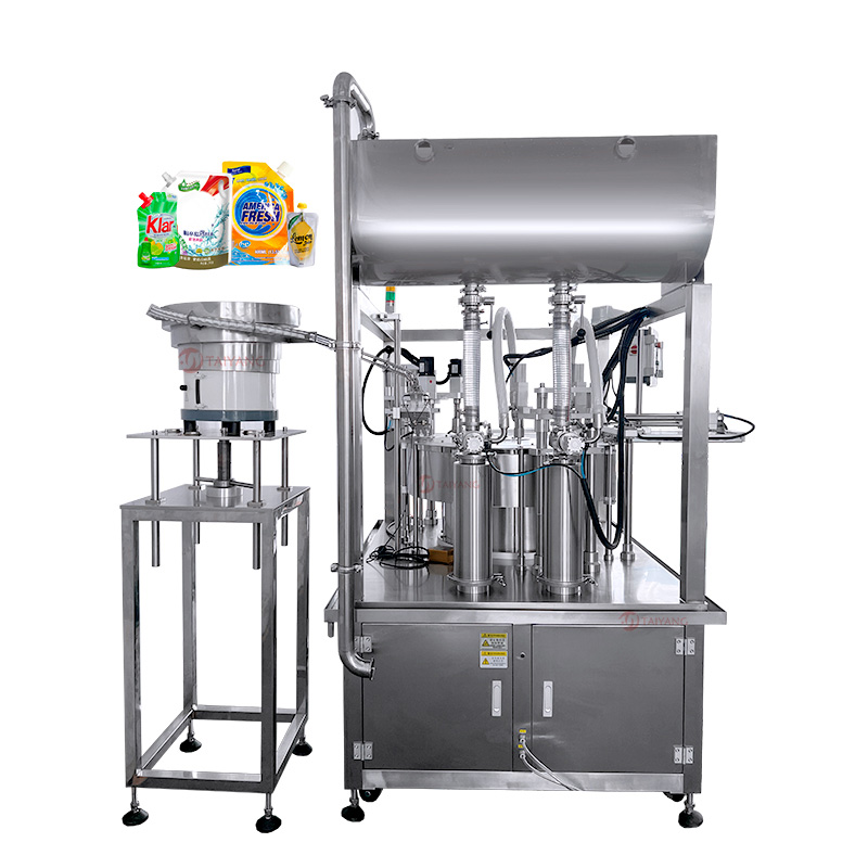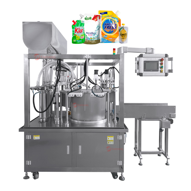 这款泰阳双头自立袋灌装旋盖机专为自立袋和吸嘴袋设计。转盘式设计在自立袋和吸嘴袋的灌装与旋盖过程中效率极高,结构运行平稳,支持连续化生产作业。在灌装环节,双头自立袋灌装旋盖机能够精准控制液体流量,确保不同容量要求的自立袋 / 吸嘴袋均能被精准灌装;无论是稀薄的水溶液,还是略带粘度的液体,都能完美适配。在旋盖方面,设备与灌装工序无缝衔接。泰阳双头自立袋灌装旋盖机配合上盖机,能够快速下盖并将盖子旋紧,有效确保袋口密封,防止液体泄漏。
