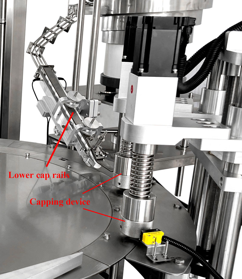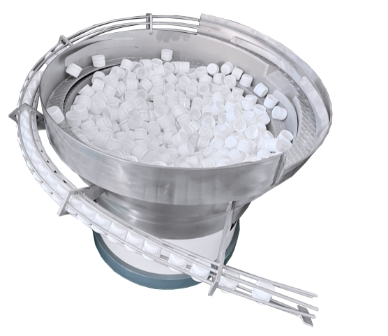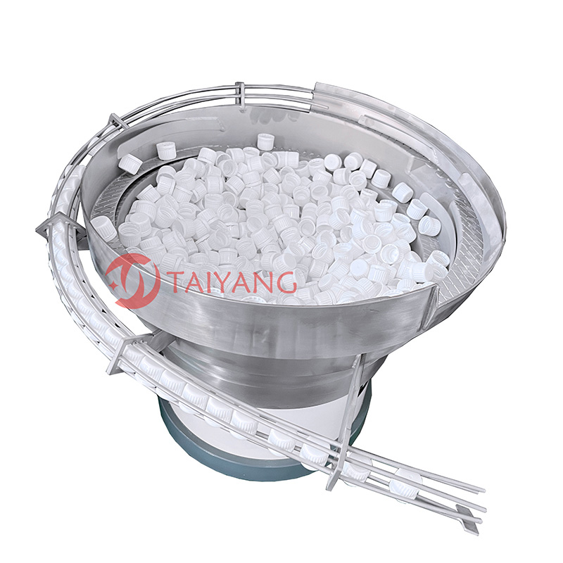 瓶盖由振动盘输送,该振动盘适用于各种瓶盖。送料导轨需要根据瓶盖进行定制。