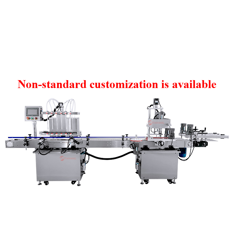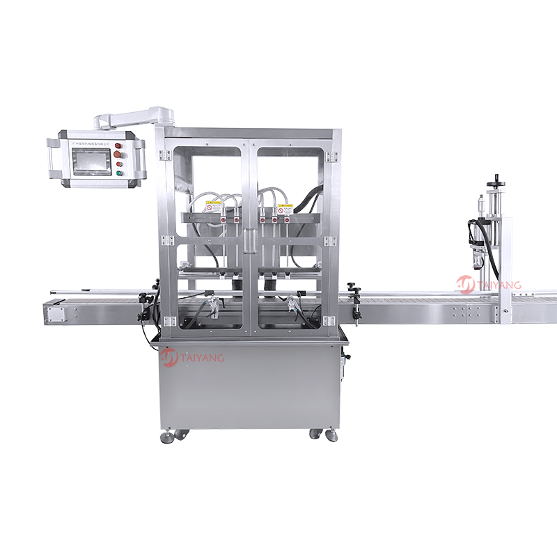 这款泰阳六头液体灌装旋盖机配备六个灌装头,可实现高效的灌装作业,特别适用于水剂及高泡溶剂的灌装。该设备采用磁力泵升降式灌装方式,由伺服电机驱动,具备响应速度快、精度高的特点。它能够灵活控制灌装过程,确保灌装的稳定性与准确性,并能对不同容量规格的容器进行精准灌装。在旋盖环节,其工作与灌装流程紧密配合。