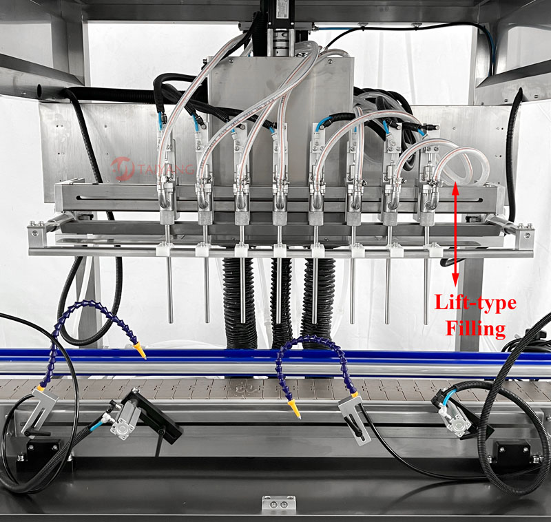 灌装头沉入容器底部,随着产品被灌装,灌装头升至液面之上,也就是说,灌装过程中灌装头不会浸入产品中。