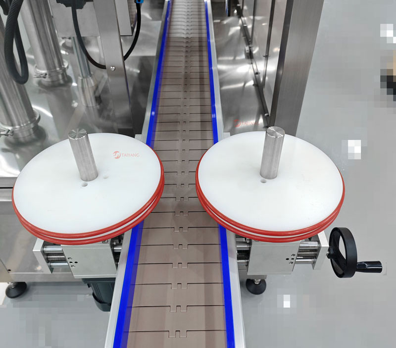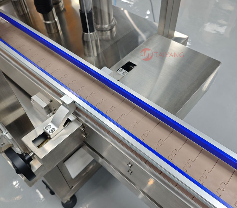 链式输送带承载能力大,能够更快、更稳定地输送瓶子。输送带的护栏可根据瓶子直径进行调节。